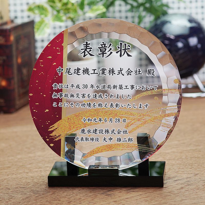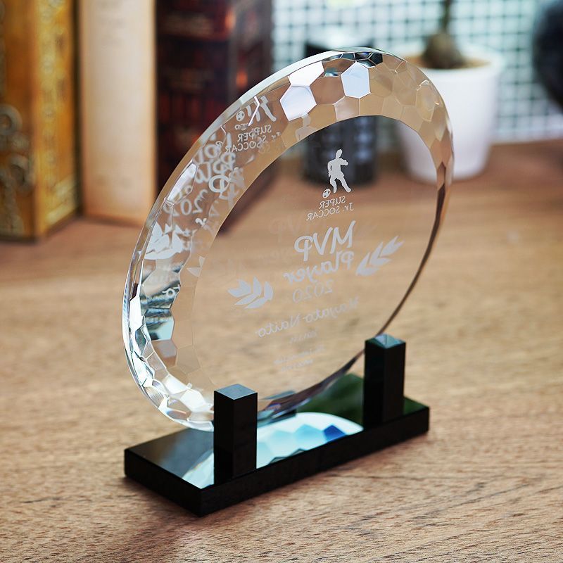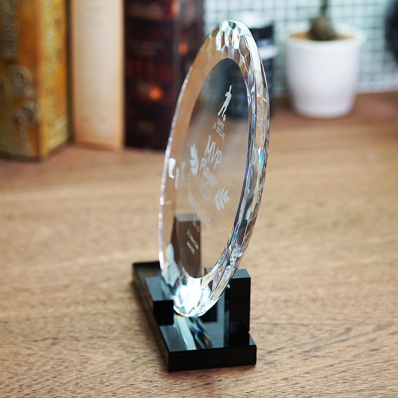 丸い円、表は平面、背面にダイヤモンドのような無数のカットを施したクリスタル製の表彰盾。